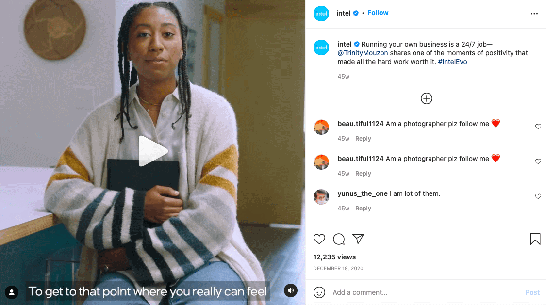 تقوم Intel بهذا بشكل جيد بشكل خاص على Instagram ، باستخدام قصص العملاء للتواصل مع مستخدمي Instagram الذين قد يمرون برحلة مماثلة ويبدأون أعمالهم التجارية الخاصة عبر الإنترنت.