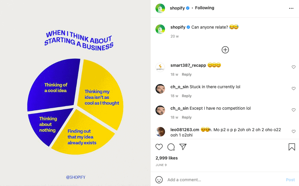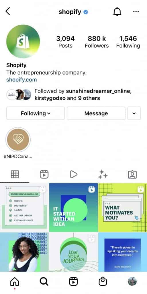 Shopify هي علامة تجارية أخرى لـ B2B تستخدم قوة Instagram لصالحها ، وذلك باستخدام مرئيات ذات ألوان زاهية وعالية التأثير ومقاطع فيديو يمكن الارتباط بها واقتباسات تحفيزية. هذه المقتطفات من المعلومات والإلهام تتحدث مباشرة إلى Shopify جمهور ؛ أصحاب الأعمال الصغيرة ورجال الأعمال.