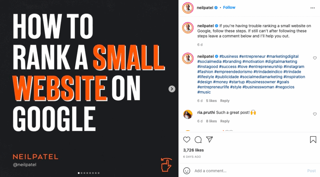 على سبيل المثال ، يقدم Neil Patel كميات لا حصر لها من المحتوى المفيد في شكل مقاطع فيديو ومدونات صوتية ومدونات ومنشورات على وسائل التواصل الاجتماعي تحتوي على نصائح ومقتطفات من المعلومات. ضمن هذا المحتوى ، غالبًا ما يضيف روابط ومعلومات حول أدواته ومنتجاته ، والتي يمكن استخدامها لمساعدة جمهوره في حل مشاكلهم ، كما في المنشور أدناه.