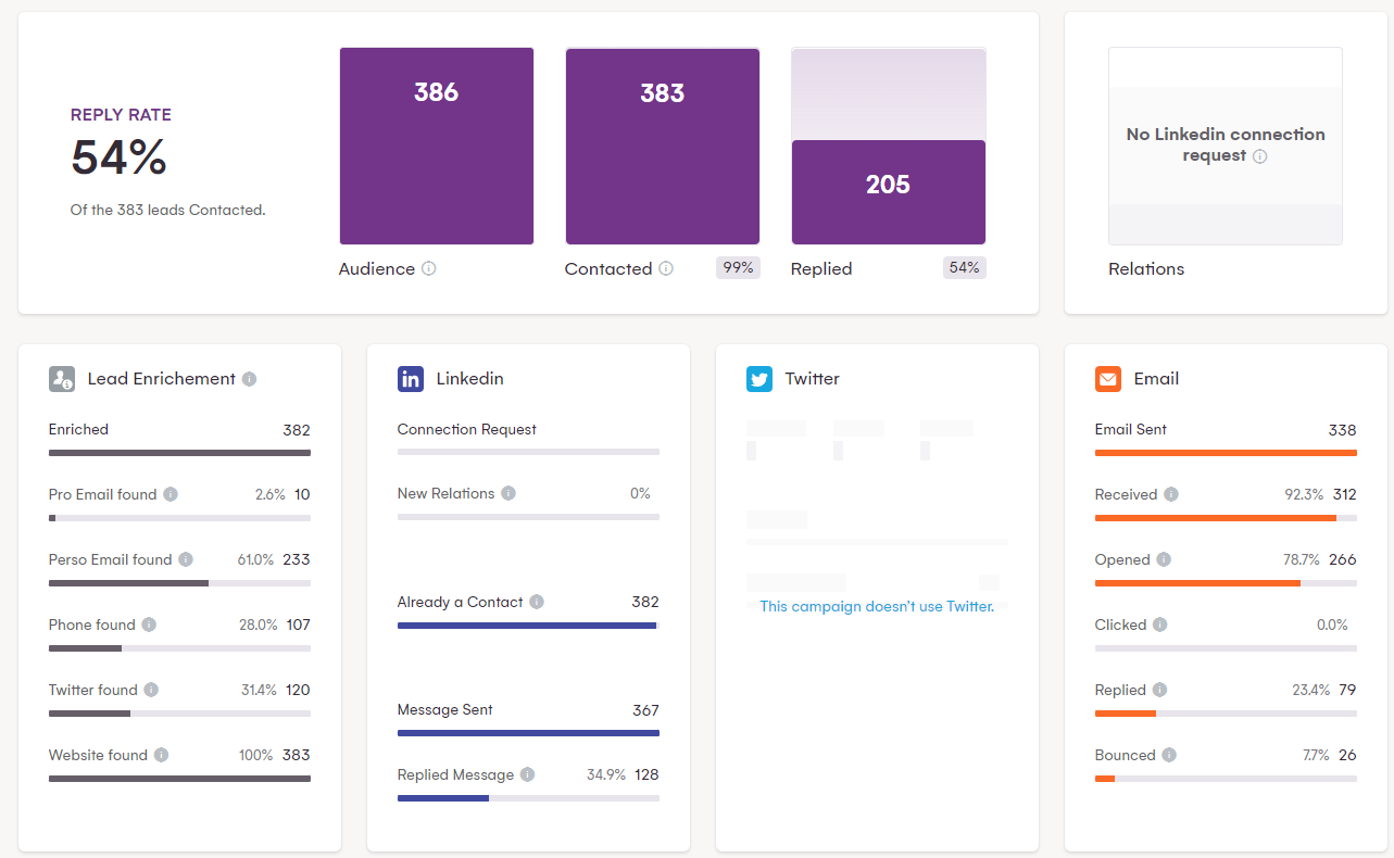 - ثم ابدأ حملتك . ستعمل LaGrowthMachine على إثراء بياناتك تلقائيًا ، لذا ستحصل على بريد إلكتروني أو حساب LinkedIn على الأقل ، وستكون قادرًا على التواصل عبر إحدى هذه القنوات - أو كليهما.