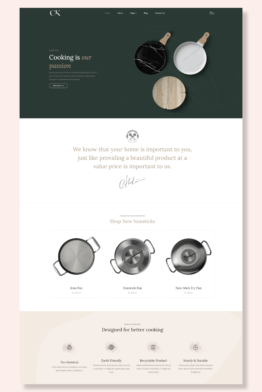 Cookly هو موضوع Shopify تتمحور حول المنتج حقًا للمستلزمات المنزلية. يسلط المظهر الضوء على المنتجات من صفحتك الرئيسية من خلال عرض صورة عالية الجودة ولافتة للنظر إلى جانب وصف موجز وميزات العنصر. يعزز التصميم الحديث أيضًا الهيكل العام لصفحتك الرئيسية ويعطي انطباعًا قويًا في أذهان الزوار.