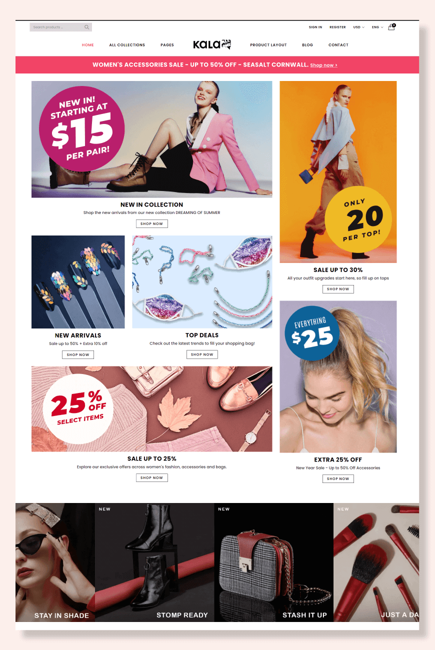كالا واحدة من أكثر موضوعات Shopify شمولية ومتعددة الأغراض في قائمتنا. من خلال مجموعة غنية من أكثر من 100 عرض إبداعي جاهز للاستخدام ، يمكنك ببساطة اختيار العرض الذي يتطابق بشكل أفضل مع هوية علامتك التجارية وإجراء التغييرات دون لمس أي سطر من التعليمات البرمجية. إلى جانب ذلك ، يأتي هذا المظهر مع أكثر من 140 قسمًا فريدًا يمكنك مزجها وتكوينها ، لذا فهي حقًا سمة Shopify مرنة وقابلة للتخصيص لأي مكان عمل.