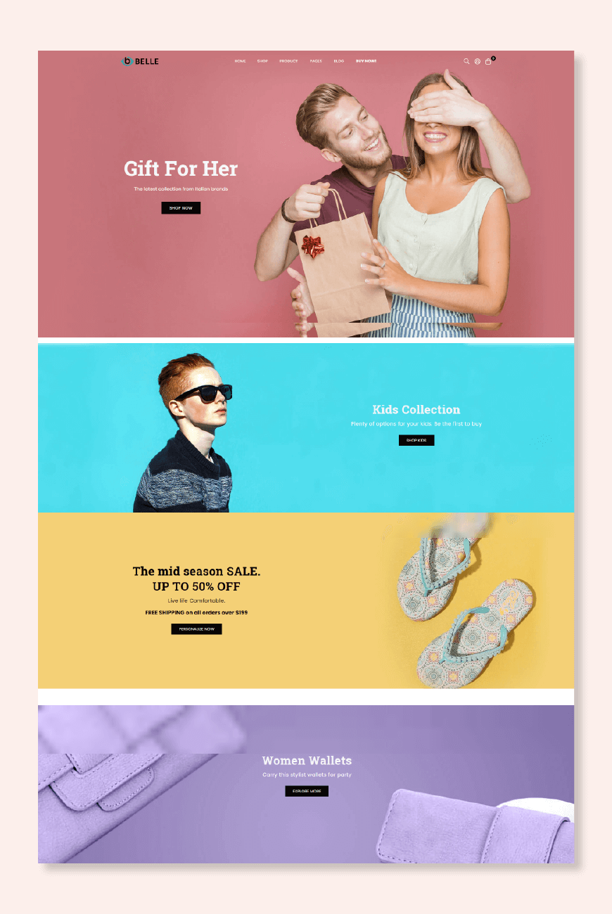 سبليت هو موضوع Shopify متميز يكتسب 100 ٪ من التقييمات الإيجابية في Shopify متاجر السمات. تكشف الصفحة الرئيسية القابلة للتمرير عن كل منتج بطريقة مذهلة يمكن أن تجعل الزائرين يقولون نجاح باهر في المرة الأولى التي يهبطون فيها على موقعك. بالإضافة إلى ذلك ، فإن التصميم الأنيق الممزوج بألوان الباستيل يثير إحساسًا بالراحة عند تصفحهم لمتجرك.