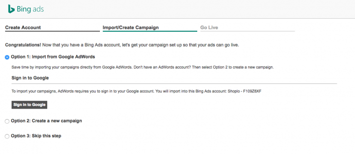 هنا لديك خيار استيراد بيانات Google Adwords الخاصة بك. سيكون ذلك مناسبًا للغاية ، لكنه لن يحقق أقصى استفادة من الميزات التي يقدمها Bing. لذلك دعونا نفعل ذلك بالطريقة الطويلة (والصحيحة). انقر على "الخيار 3: تخطي هذه الخطوة" واضغط على "متابعة" ، ثم اضغط على "تخطي" عند طلب معلومات الفوترة. سنصل إلى كل ذلك بعد ذلك.