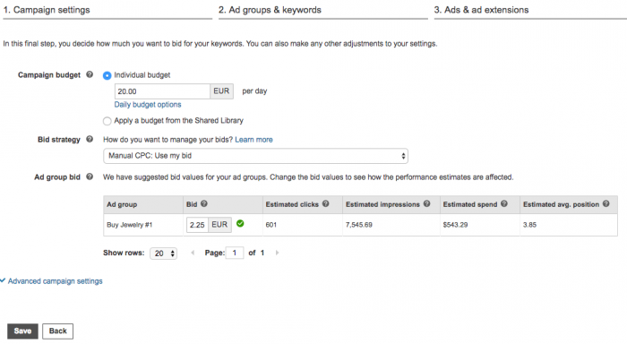في هذه النافذة ، ستحدد كيفية إنفاق ميزانيتك الإعلانية. فكر في الأمر كمزاد. عرض تسعير الكلمة الرئيسية هو أقصى سعر ترغب في دفعه في كل مرة يتم فيها النقر فوق إعلانك ، ولكن التكلفة الفعلية قد تكون أقل بكثير. إذا لم يكن عرض التسعير الخاص بك أعلى من المنافسة ، فقد لا يتم عرض إعلانك في نتائج البحث الأعلى تصنيفًا. تختلف توقعات الحملة الإعلانية. لذلك لغرض هذا المثال ، سنستخدم اقتراح Bing بميزانية قدرها 20 يورو لكل يوم. يعتمد مقدار المزايدة الذي تقدمه لإعلانك ليتم وضعه في مكان ما على بعض الأشياء. نتحدث أكثر عن ذلك هنا في مدونة Google Adwords الخاصة بنا. قصة قصيرة طويلة ، تحتاج إلى معرفة مقدار ربحك لكل عملية بيع التي تريد إنفاقها بالإضافة إلى معدل التحويل الخاص بك.