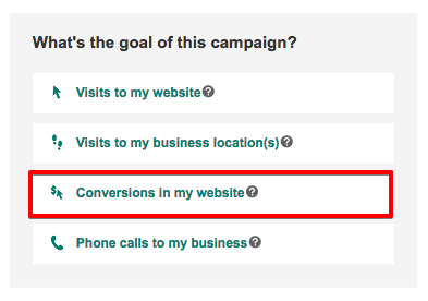 الهدف من حملة إعلانات منتج Bing هو بيع بعض المنتجات ، لذلك نريد النقر فوق "التحويلات في موقع الويب الخاص بي" كهدف رئيسي لحملتنا.