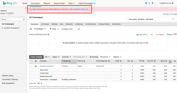 لبدء عرض إعلاناتك ، تحتاج إلى إعداد طريقة دفع. كما هو موضح في الصورة أعلاه ، لم نقم بذلك! انقر فوق "إضافة طريقة دفع الآن" ، سترشدك الصفحة التالية إلى كيفية إعداد طرق الدفع الخاصة بك. يرجى العلم أنه كعميل جديد ، قد يستغرق الأمر ما يصل إلى 72 ساعة حتى يتم نشر إعلاناتك. الآن تم إعداد حملة إعلانات منتجات Bing الخاصة بك وهي جاهزة للانطلاق! مثل معظم الأشياء في الإعلان ، من المفيد التحليل والتكيف إذا لزم الأمر. حافظ على ميزانيتك قريبة من ميزانيتك واكتشف ما إذا كانت حملتك الإعلانية تُحدث تأثيرًا في مبيعاتك ، أو مجرد انخفاض في حركة المرور. قد تؤدي إضافة كلمات رئيسية إلى مجموعتك الإعلانية إلى زيادة أموالك أيضًا ، فقد يأتي إنشاء إعلانات المنتج في المرتبة الثانية بعد إعلانات Google ، ولكنه محرك بحث يتزايد بسرعة ويمكنه أن يظل علامتك التجارية في مقدمة العديد من العملاء الجدد!