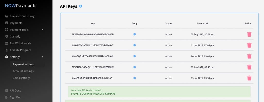 - بعد إضافة العنوان ، ستتمكن من إضافة مفتاح API جديد مطلوب لإنشاء المدفوعات وتتبع حالات المعاملات: