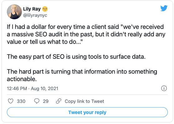 Ganz zu schweigen von den zahlreichen SEO-Tools, die fortschrittlich und großartig darin sind, SEOs auf Probleme hinzuweisen, aber nicht in der Lage sind, tatsächlich „SEO zu betreiben“.
