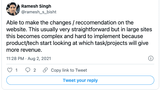 Ramesh Singh, Head of SEO bei Great Learning, wiederholt diesen Punkt als Antwort auf die Frage: „Welche SEO-Funktion/Aufgabe wünschen Sie sich am meisten, Sie könnten sie schneller und in größerem Umfang erledigen, als Sie es jetzt können?“