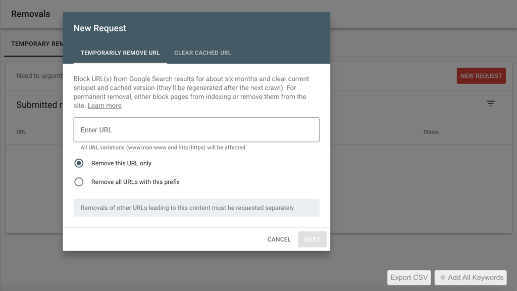 Während ein 301 das Problem lösen könnte, wohin Ihr Besucher geht, kann die anstößige Seite dennoch in den Suchergebnissen erscheinen. Glücklicherweise können Sie GSC verwenden, um die Entfernung von Inhalten aus den Suchergebnissen zu beantragen.