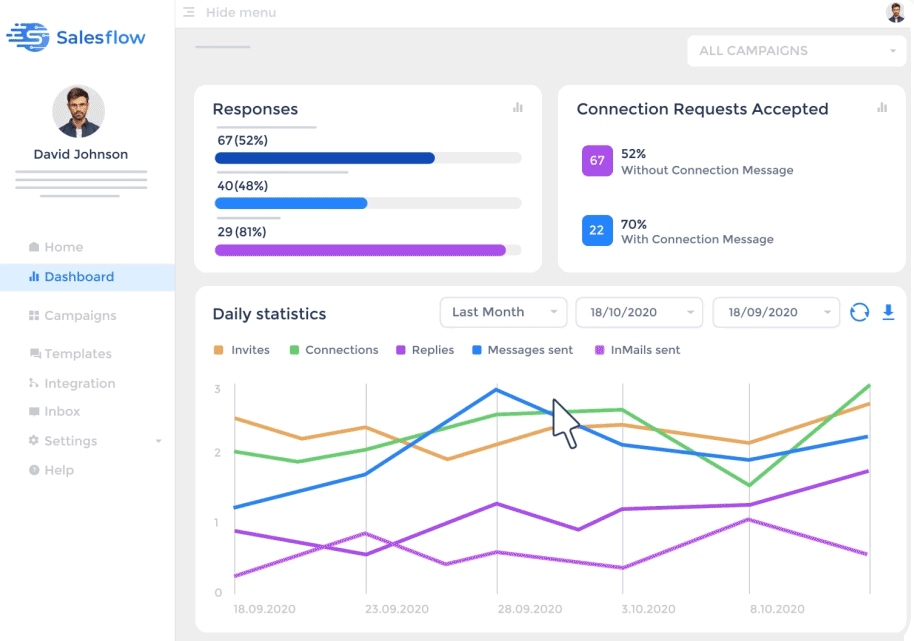 Mit Salesflow können Sie mehrere Kampagnen durchführen, Ihre Aktivitäten über ein einziges Dashboard verwalten und unbegrenzte Nachrichten planen. Die Plattform bietet außerdem erweiterte Berichtsfunktionen und hervorragende Filterfunktionen.