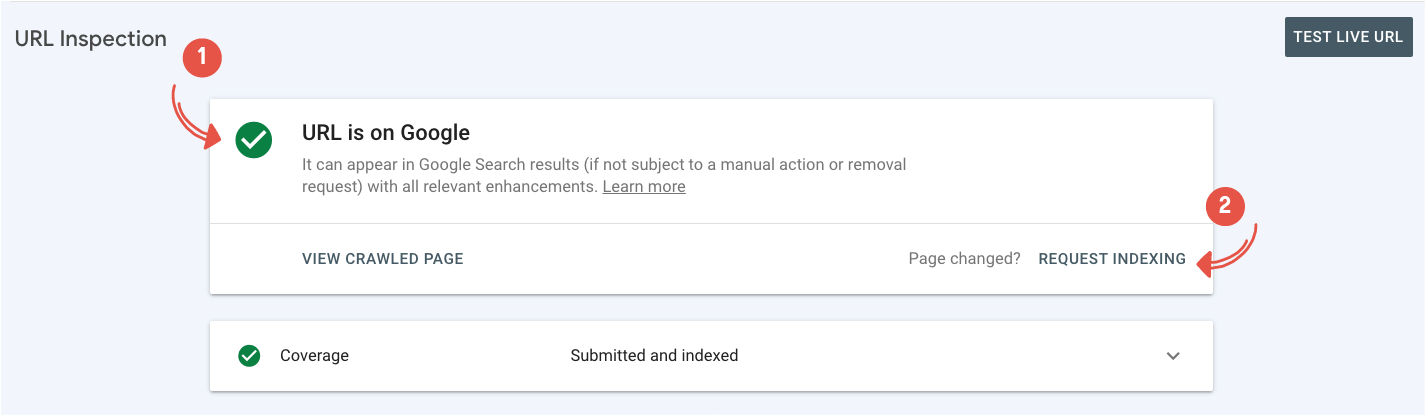 Nachdem die GSC die URL überprüft hat, teilt sie Ihnen mit, ob sie im Index von Google enthalten ist und welche Erweiterungen sie erkennt. Klicken Sie im ersten Feld auf „Indexierung anfordern“, um Google zu bitten, Ihre Seite erneut zu crawlen, damit Ihre neu optimierten Inhalte gefunden werden.