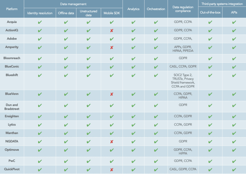 Entdecken Sie die Plattformfunktionen von Anbietern wie Blueconic, Tealium, Treasure Data und anderen im vollständigen MarTech Intelligence Report zu Kundendatenplattformen .