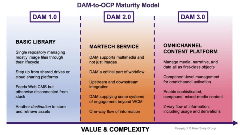 Ob es Ihnen gefällt oder nicht, der DAM-Markt ist im Hinblick auf die Fähigkeiten der Anbieter, jede dieser Phasen zu bedienen, ziemlich fragmentiert. Wir haben definitiv Fälle gesehen, in denen Unternehmensambitionen von ihrem etablierten DAM-Anbieter gedrosselt wurden. Aus dem gleichen Grund habe ich gesehen, dass Unternehmen diese Technologie überkaufen. Ein objektorientiertes DAM 3.0 (OCP)-Toolset bringt notwendigerweise viel kompliziertere Schnittstellen und Integrationsanforderungen mit sich, und ein Unternehmen, das auf diese Komplexität nicht vorbereitet ist, wird hier negative Renditen sehen.