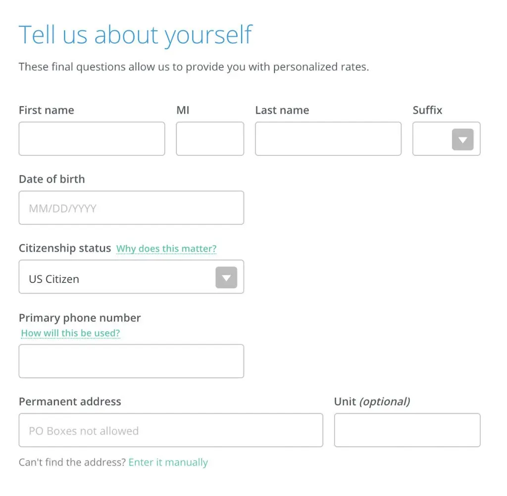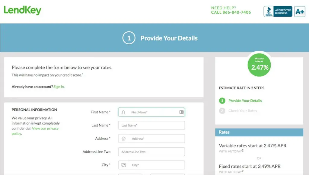 Wie bei Credible können Sie Ihre Tarife von mehreren Anbietern gleichzeitig überprüfen, nachdem Sie einige grundlegende Informationen wie Ihren Namen, Ihre Adresse, Ihren Kreditbetrag und Ihr Bildungsniveau eingegeben haben.
