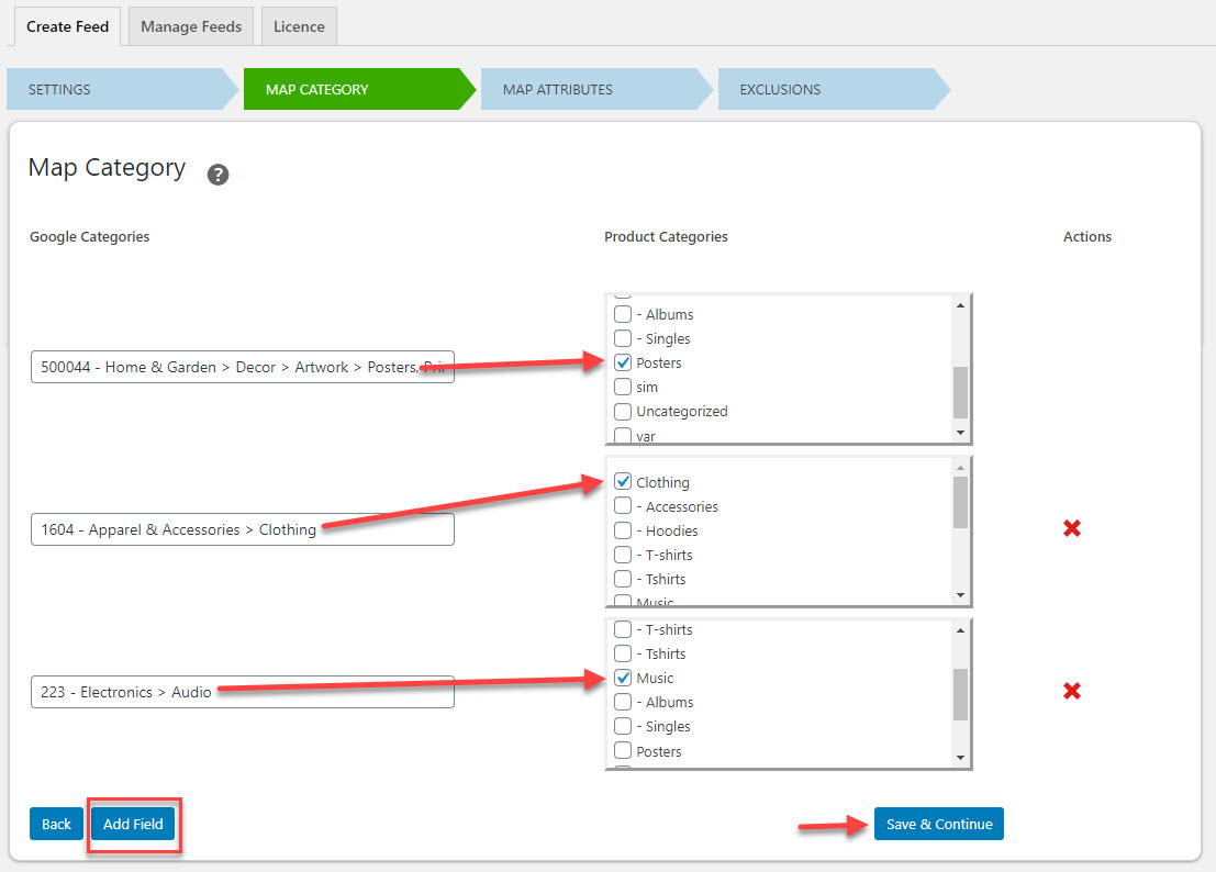 Im nächsten Schritt können Sie Google-Kategorien Ihren Produktkategorien zuordnen. Um eine verwandte Google-Kategorie abzurufen, können Sie Ihren Kategorienamen in das Feld Google-Kategorie eingeben. Das Plugin zeigt eine Reihe von Optionen an, aus denen Sie die passende auswählen können. Mindestens eine Shop-Kategorie sollte mit einer Google-Kategorie abgeglichen werden. Sie können mehrere Kategorien zuordnen, indem Sie auf die Schaltfläche Feld hinzufügen klicken.