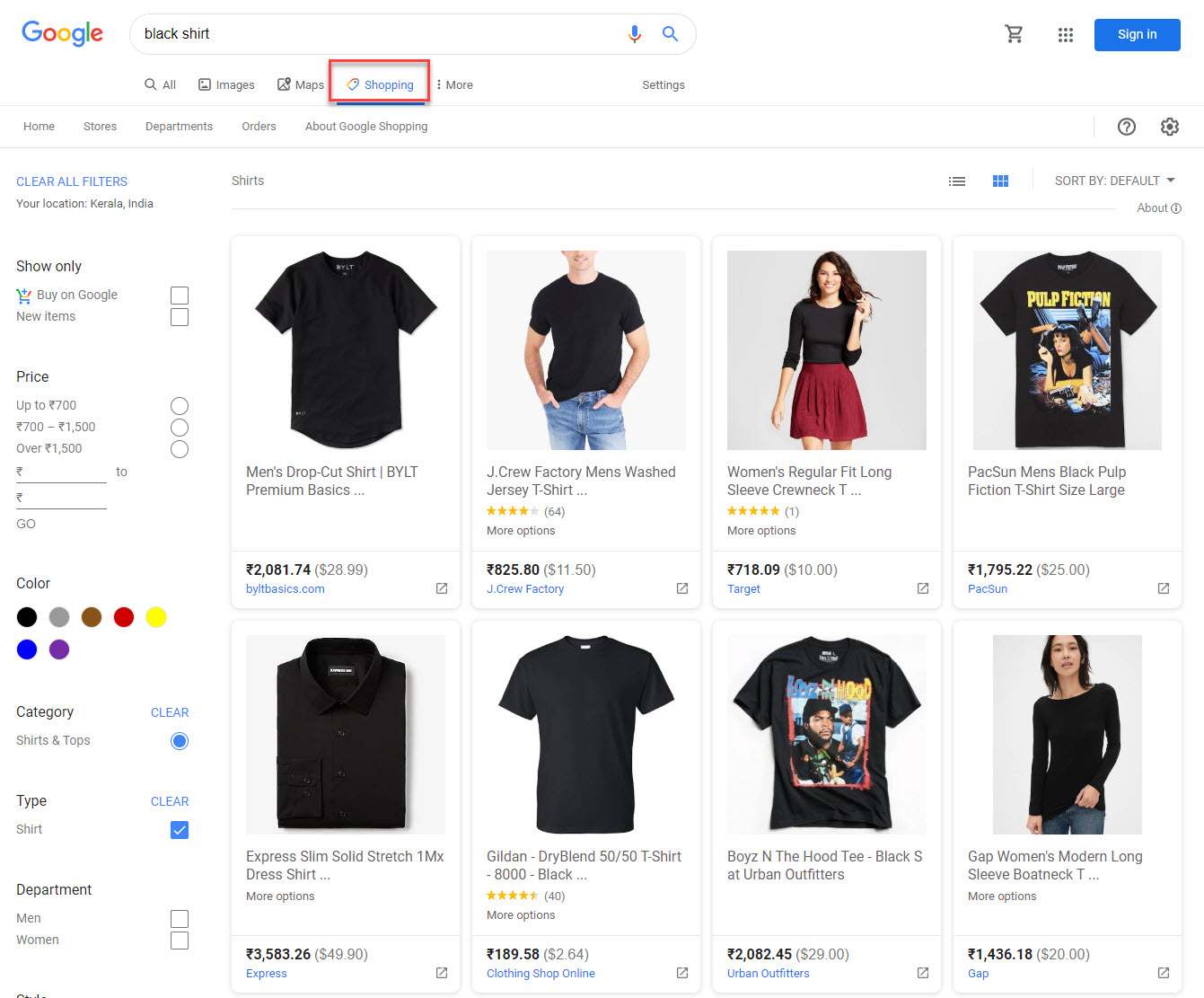 Sie können auch auf die Registerkarte "Einkaufen" von Google klicken, um direkt zu diesen Einträgen zu gelangen.