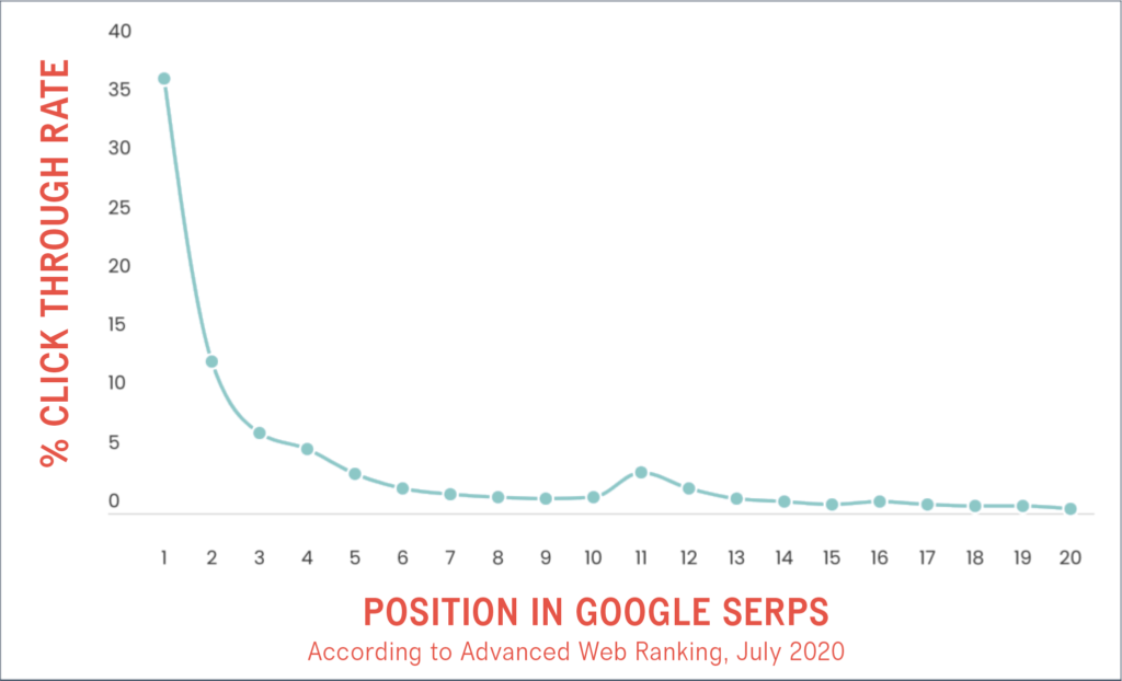 Solo el 5% de los usuarios de Internet informan que exploran los resultados en la segunda página de una búsqueda en Google. ¿Alguna vez has escuchado la máxima de SEO de que los resultados de búsqueda detrás de la página uno están todos empatados en el último lugar? Se explica en el siguiente gráfico: