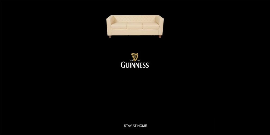 En este caso, la icónica pinta de cabeza de espuma de Guinness se ha sustituido por un sofá, en el característico color crema, por supuesto. El centro está estampado con el antiguo logotipo de Guinness y el ícono del arpa, y un mensaje simple y bien posicionado de "Quédate en casa" en la parte inferior proporciona todo lo que tu cerebro necesita para completar la imagen.