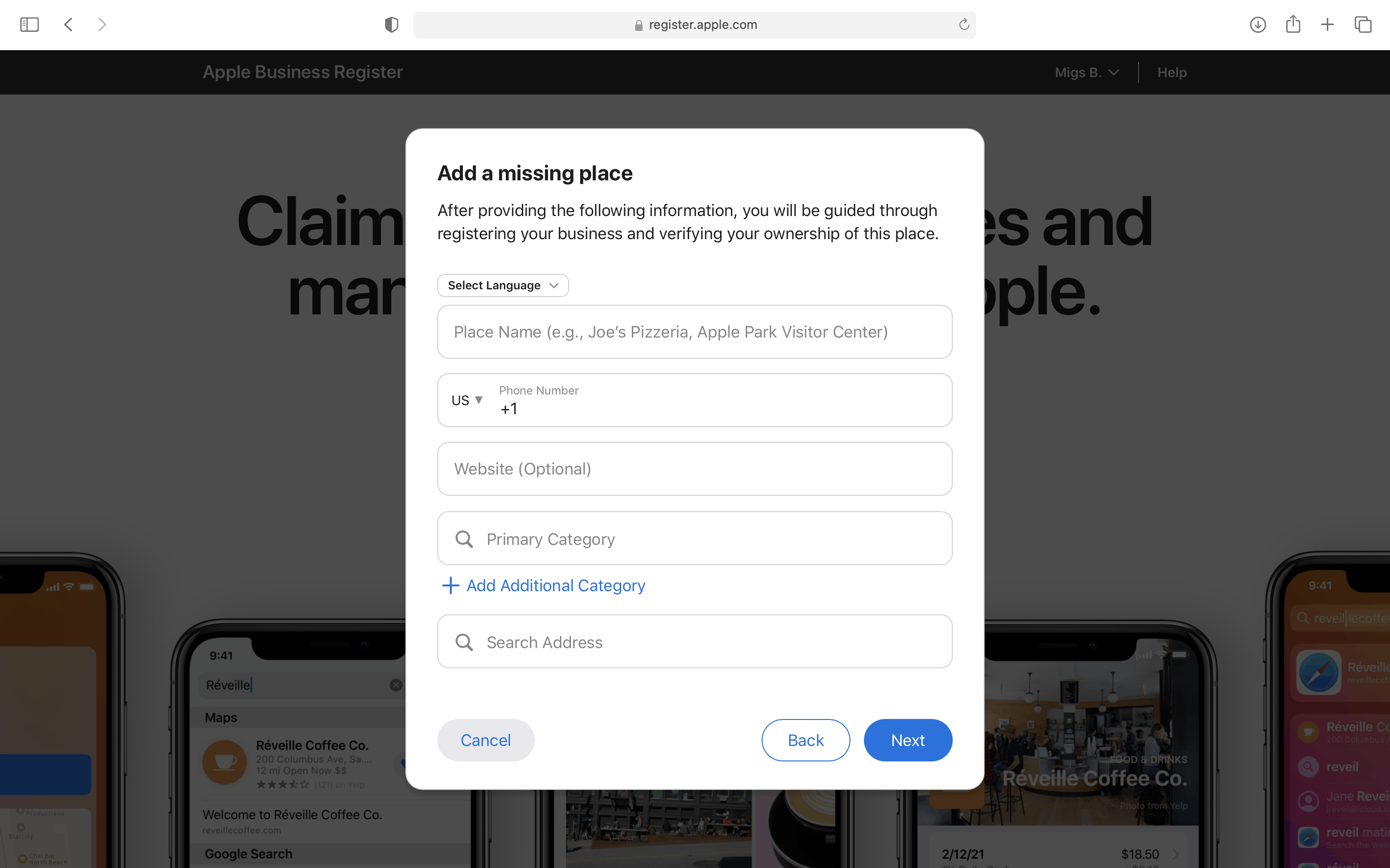 El portal donde se administran sus listados comerciales (llamados "tarjetas de lugar") se llama Apple Business Register . Piense en ello como similar al panel de control de Google My Business de Google.