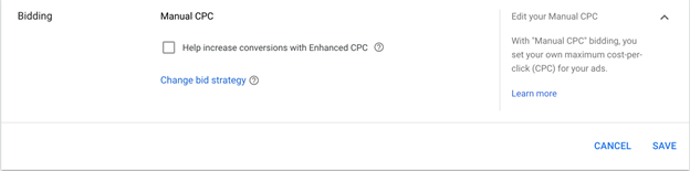 Con este tipo de oferta, ajusta todas sus ofertas manualmente en cualquier nivel que desee: nivel de campaña, palabra clave o grupo de anuncios. Simplemente dígale a Google la cantidad máxima que está dispuesto a ofertar en una subasta por sus palabras clave. Usted toma todas las decisiones y toma medidas en su cuenta de Google Ads sin ninguna solución inteligente.