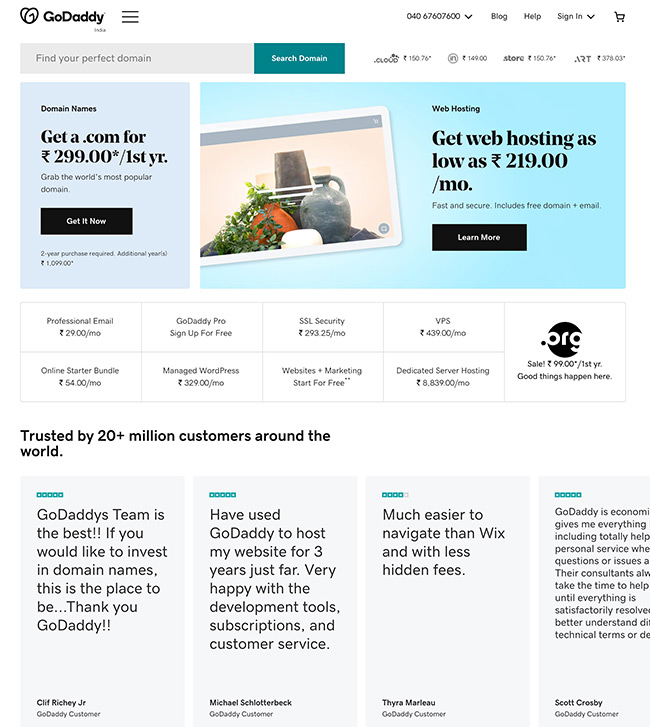 GoDaddy es una marca antigua y bien establecida en alojamiento de Internet que se suma a su confiabilidad y confianza. Además, el trato tres en uno que ofrece es una de las principales ventajas de la plataforma. Para los usuarios que no quieren tener que acudir a diferentes plataformas y empresas para alojamiento, registro de dominios y creación de sitios web, GoDaddy es perfecto.