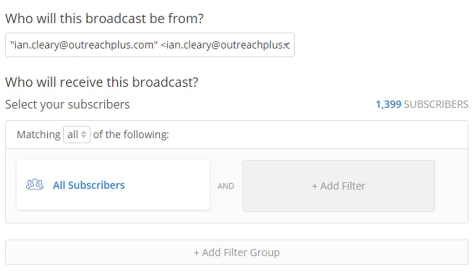 El primer paso es elegir qué suscriptores desea que reciban su transmisión o segmentar suscriptores en función de filtros específicos. A continuación, podrá seleccionar su plantilla de correo electrónico y escribir el contenido de su transmisión. Nada complicado al respecto.