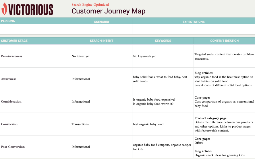 Por ejemplo, así es como podría verse cuando una empresa que vende alimentos orgánicos crea un mapa de viaje del cliente centrado en la intención de búsqueda: