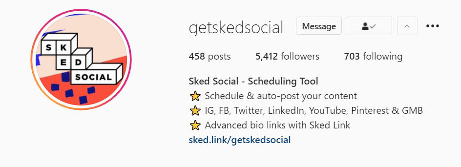 Su nombre de perfil también brinda una gran oportunidad para que las personas sepan lo que hace. Por ejemplo, el nuestro es Sked Social – Scheduling Tool . Si su empresa o producto no queda claro de inmediato solo con el nombre de su empresa, agregar una pequeña descripción puede ayudar a aclarar qué tipos de productos pueden encontrar las personas en su tienda.