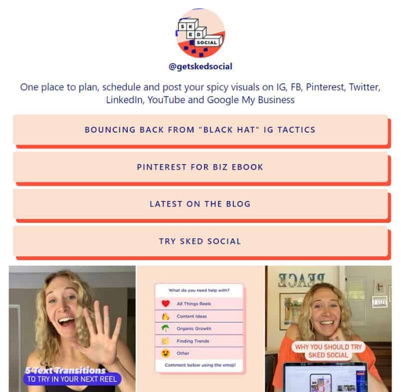¿Necesitas más de un enlace? Considere la posibilidad de configurar una página de destino personalizada o un servicio similar que le permita vincular varias páginas en un solo lugar. Recomendamos el enlace de Sked Social en la herramienta bio, Sked Link . Sked Link le permite hacer un mejor uso del enlace de su perfil de Instagram agregando botones a cualquier parte de la web. Puede crear una galería de sus publicaciones de Instagram que dirija fácilmente a los usuarios a la página correcta. ¡Además, se puede diseñar para que todo esté a la altura de la marca!