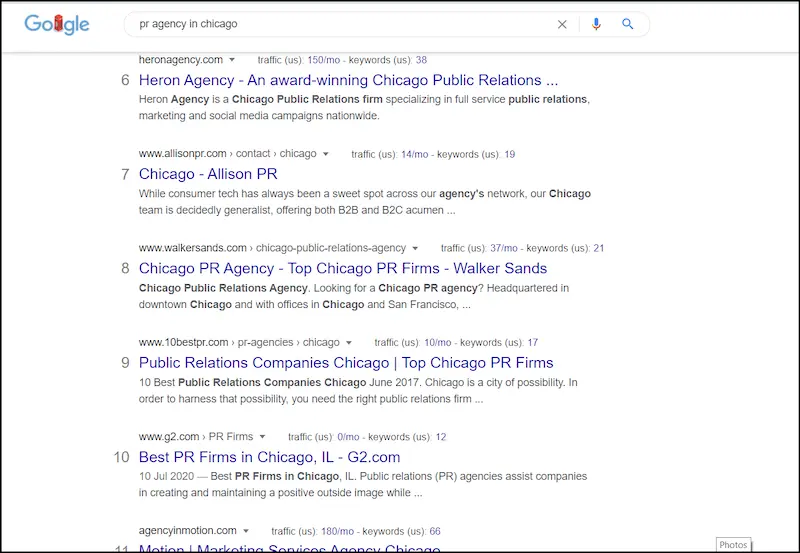 Entonces, para este paso, simplemente busque en Google "Agencia de relaciones públicas en [mi área local]" y anote las agencias locales que aparecen en la búsqueda.