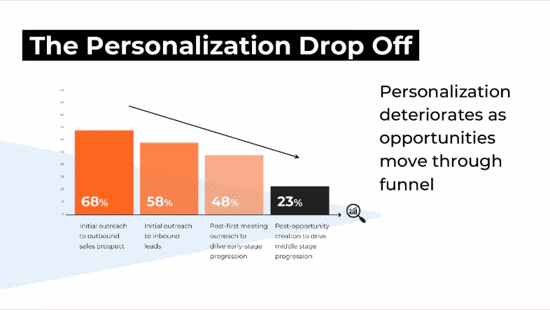 Neisser señaló los datos de personalización (que se muestran arriba), destacando el hecho aleccionador de que la personalización se deteriora a medida que los clientes potenciales avanzan en el embudo de ventas. Los especialistas en marketing pueden ayudar a abordar este problema ajustando su estrategia ABM para ofrecer más opciones de personalización en cada punto de contacto.