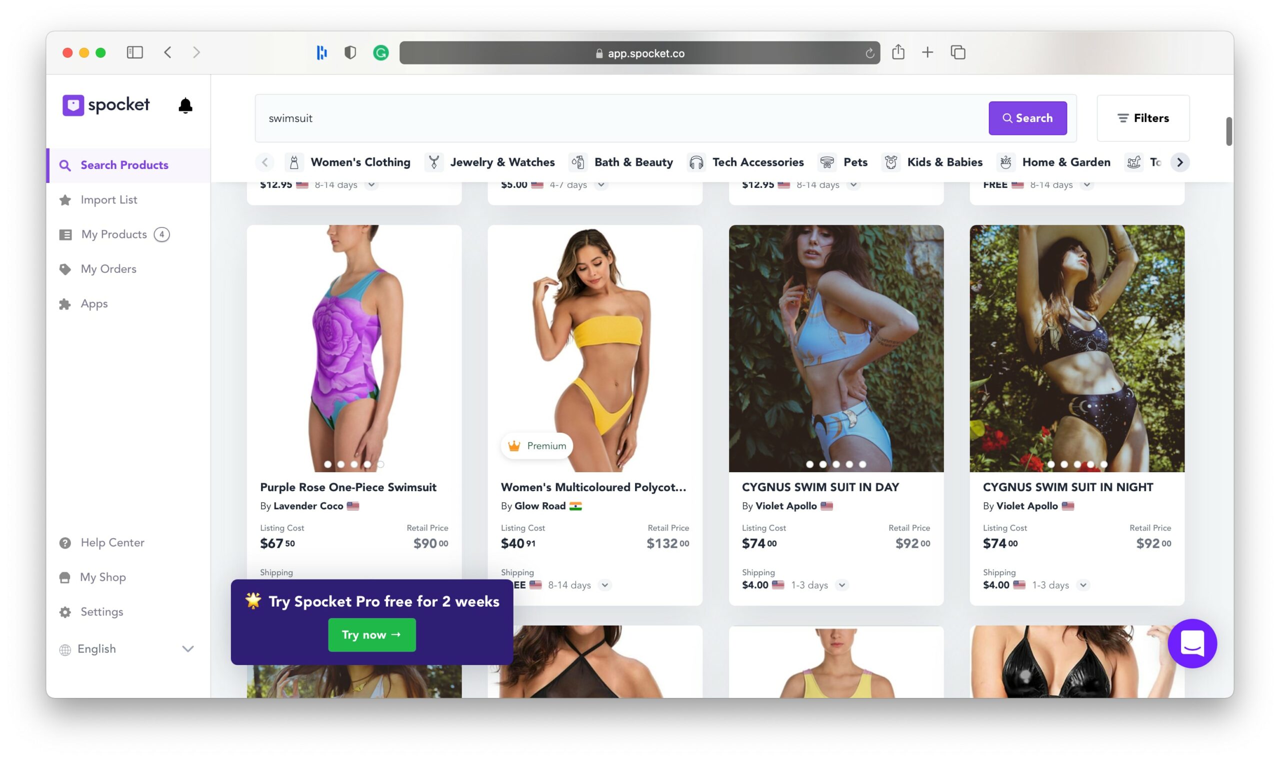 Si fabricar su propia línea de trajes de baño no es para usted, la forma más fácil y rápida de obtener trajes de baño es a través del modelo comercial de envío directo. De esta manera, simplemente selecciona los productos que desea vender de un proveedor de dropshipping como Spocket y comienza a venderlos en su sitio web. Alternativamente, puede utilizar una empresa de impresión bajo demanda como Printful. Con ellos, puedes enviar tus propios diseños para que se impriman en sus trajes de baño.