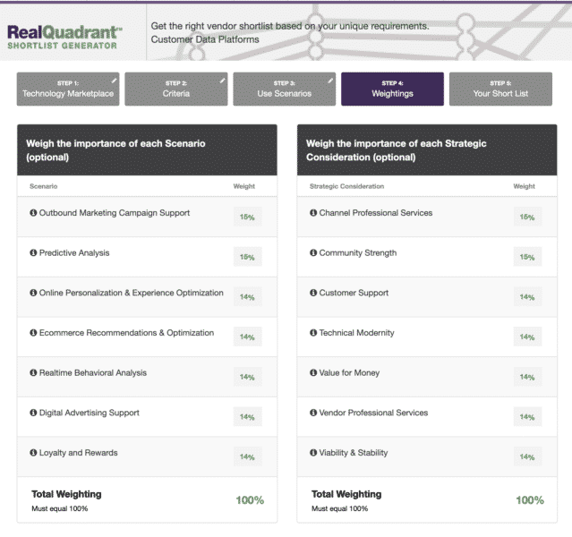 Entonces, en RSG hemos aprendido a ver los riesgos de viabilidad y continuidad como un desafío multidimensional, junto con la estabilidad y una operación de desarrollo de productos próspera, como una canasta de problemas estratégicos para explorar al realizar la diligencia del proveedor. En nuestra herramienta de soporte de decisiones RealQuadrant, ocupan un lugar destacado entre los factores de "Consideraciones estratégicas" que conforman el eje Y de los cuadrantes personalizados que se generan.