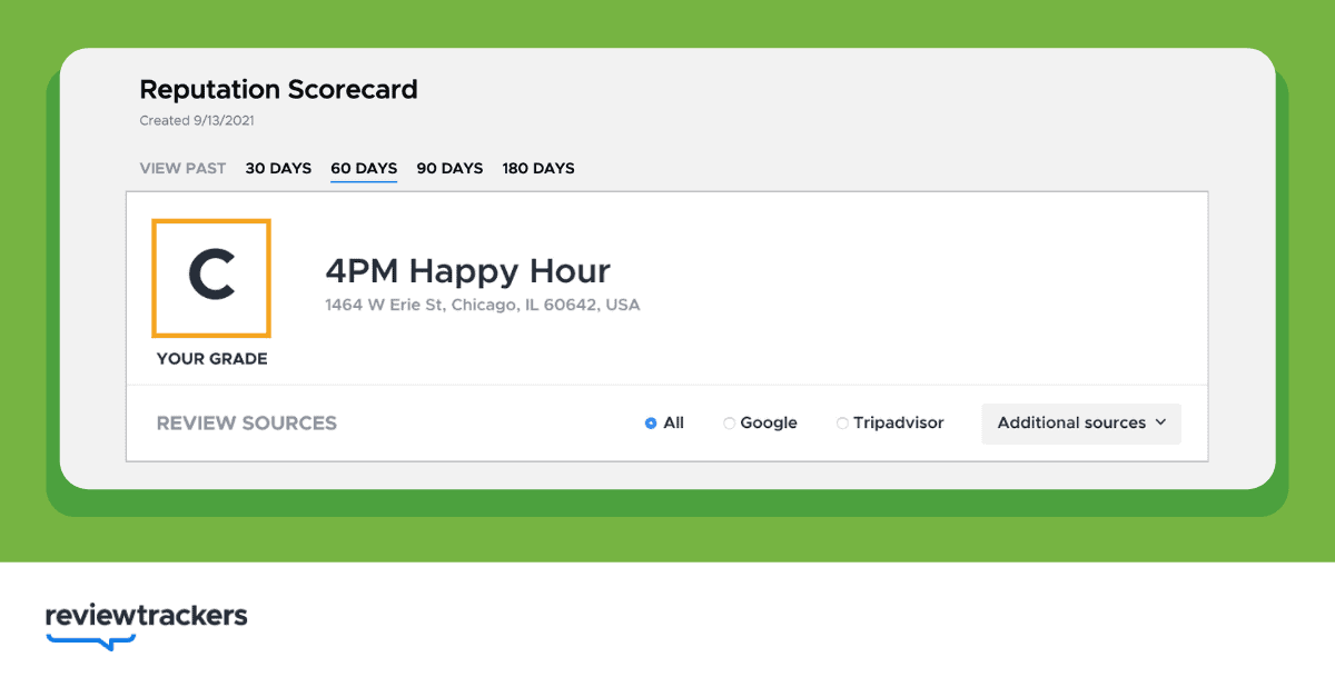 El puntaje de reputación y la tarjeta de informe de ReviewTrackers deberían ayudarlo a eliminar las conjeturas de su estrategia de administración de reputación. La herramienta gratuita genera instantáneamente el informe de reputación en línea de su marca y proporciona una instantánea de su desempeño. Esto incluye reseñas destacadas, calificaciones, tendencias de palabras clave, tasa de respuesta de reseñas y tiempos de respuesta promedio, y más.