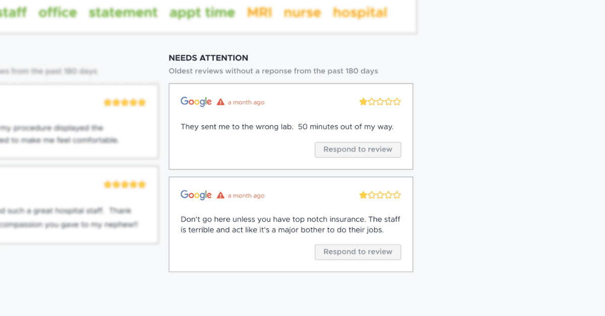 Reseñas destacadas y Necesita atención, ubicadas justo debajo de Palabras clave de uso frecuente en su Puntaje de reputación y Boleta de calificaciones, son dos secciones que muestran reseñas recientes de todos los sitios de reseñas de empresas o de los que usted seleccionó . Los datos que se muestran también se basan en el intervalo de fechas seleccionado.
