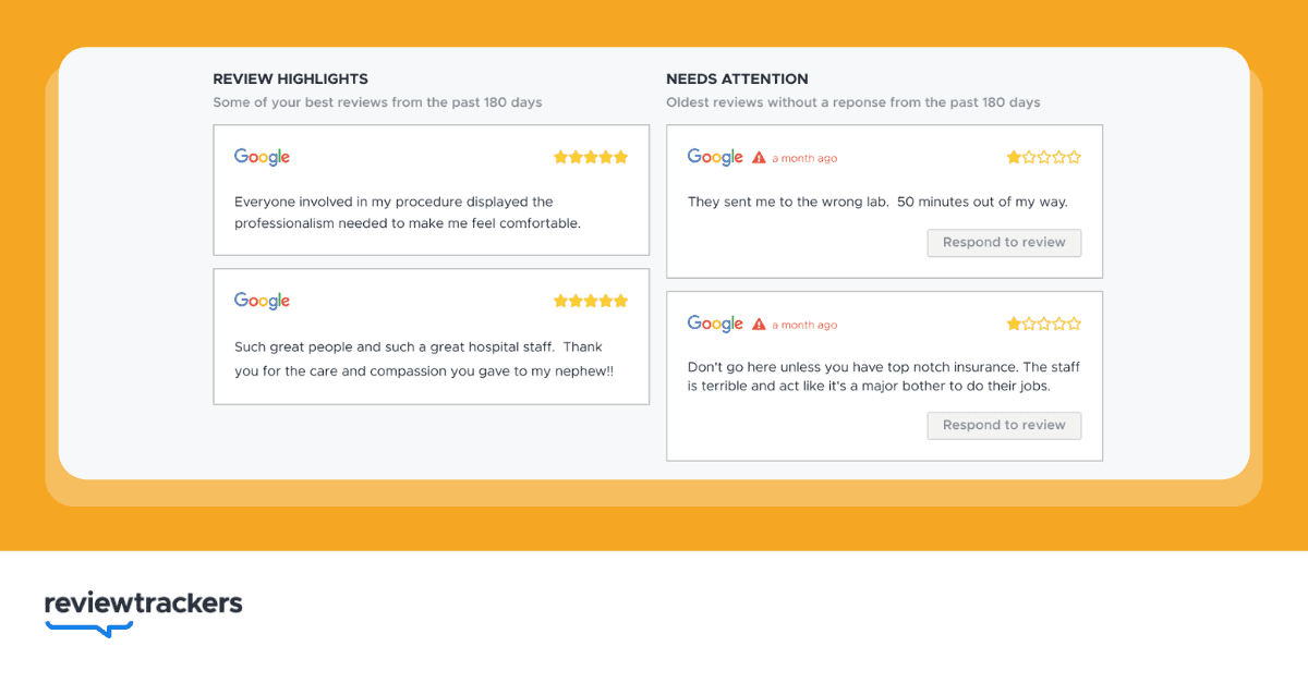 Necesita atención, por otro lado, muestra ejemplos de críticas negativas que su empresa debería abordar. Esta sección incluye enlaces "Responder a la revisión", que lo llevan a las páginas de revisión originales.
