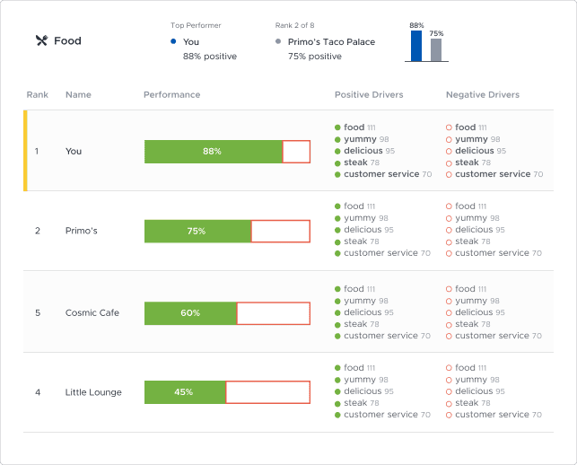 En el ejemplo anterior, palabras como "comida" y "hamburguesa" se mencionan con frecuencia en las reseñas de 4PM Happy Hour y los clientes tienen cosas buenas que decir en la mayoría de los casos. El "servicio" también se menciona con frecuencia, pero los clientes no están necesariamente contentos con él: una señal de que el "servicio" debe ser un área de enfoque para 4PM Happy Hour, ya que funciona para mejorar la reputación de la marca.