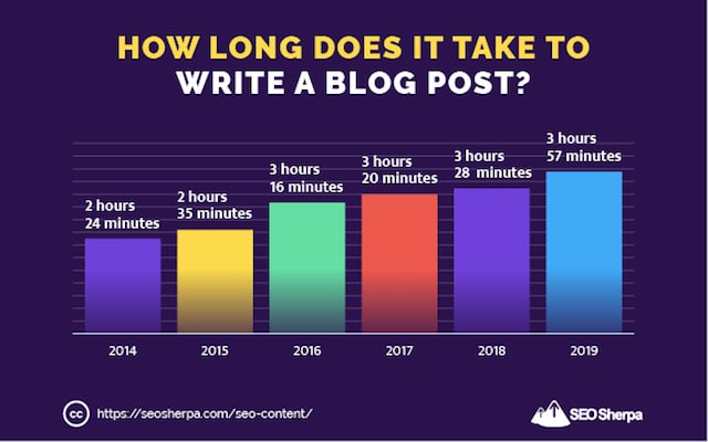 En un estudio realizado por Andy Crestodina de Orbit Media, una publicación de blog típica (1000-1500 palabras) tarda casi cuatro horas en escribirse.