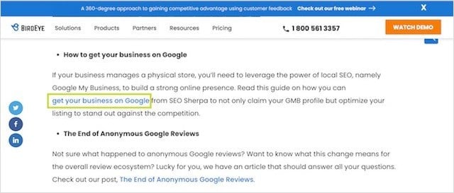 Como puede ver en el ejemplo de BirdEye, un resumen de enlaces es una lista de contenido seleccionado para una industria o nicho específico.