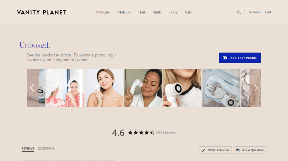 Vanity Planet tiene una sección en sus páginas de productos dedicada a las imágenes de los clientes de Instagram.