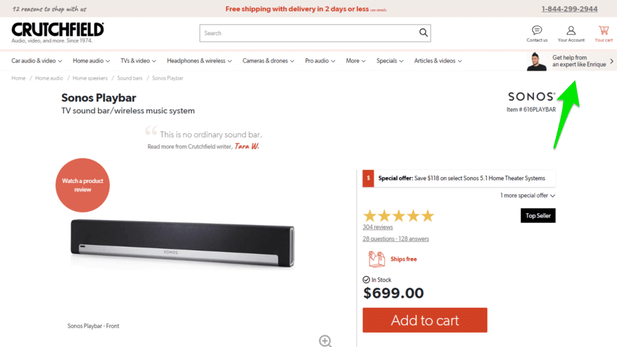 De manera similar, Crutchfield ofrece a los clientes la opción de pedir instantáneamente opiniones y orientación a los expertos. El uso de esta función no solo alivia las dudas de los clientes, sino que incluirla también implica que estos asesores están dispuestos a respaldar los productos.