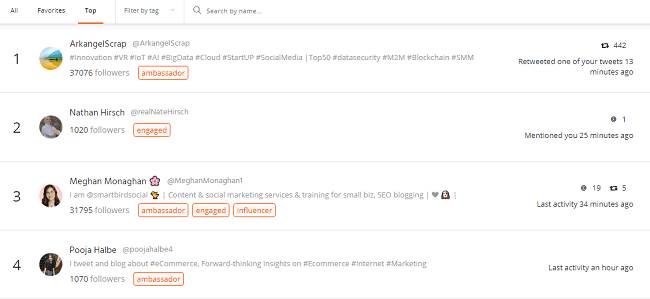 Con AgoraPulse, puedes filtrar tu audiencia para ver quién de tus seguidores tiene la audiencia más grande y se involucra más con tu contenido. Básicamente, la herramienta te permite identificar automáticamente a cualquier persona influyente que te siga en Twitter.
