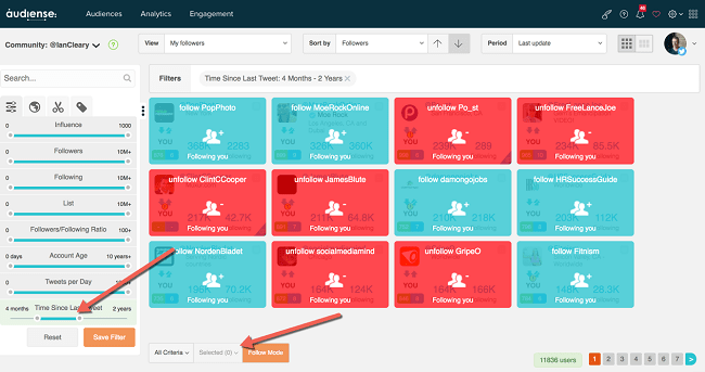 Como puede ver en la imagen de arriba, puede establecer el período de tiempo desde el último tweet y Audiense mostrará a sus seguidores inactivos con la opción de dejar de seguirlos.