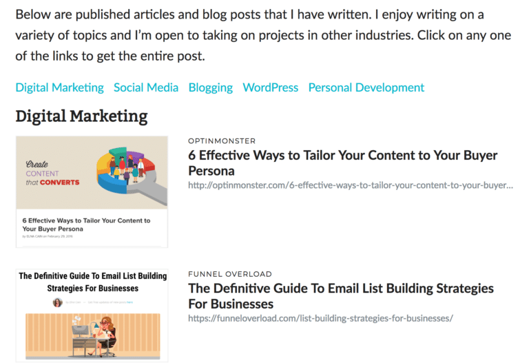 Debido a que mi página de portafolio en el sitio web de mi escritor está categorizada, es fácil para mí elegir las mejores muestras de escritura en cualquier nicho de escritura que necesite.