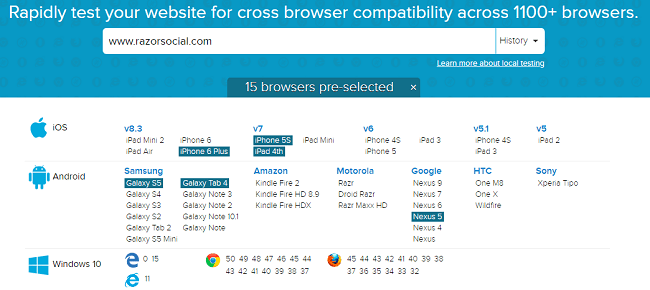 Cuando ingresa la dirección de su sitio web, ya hay 15 navegadores seleccionados. Puede continuar su prueba usando estos navegadores o seleccionar lo que quiera mostrar.