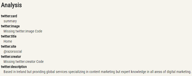 Veamos el análisis de razorsocial.com para los datos de la tarjeta de resumen de Twitter.