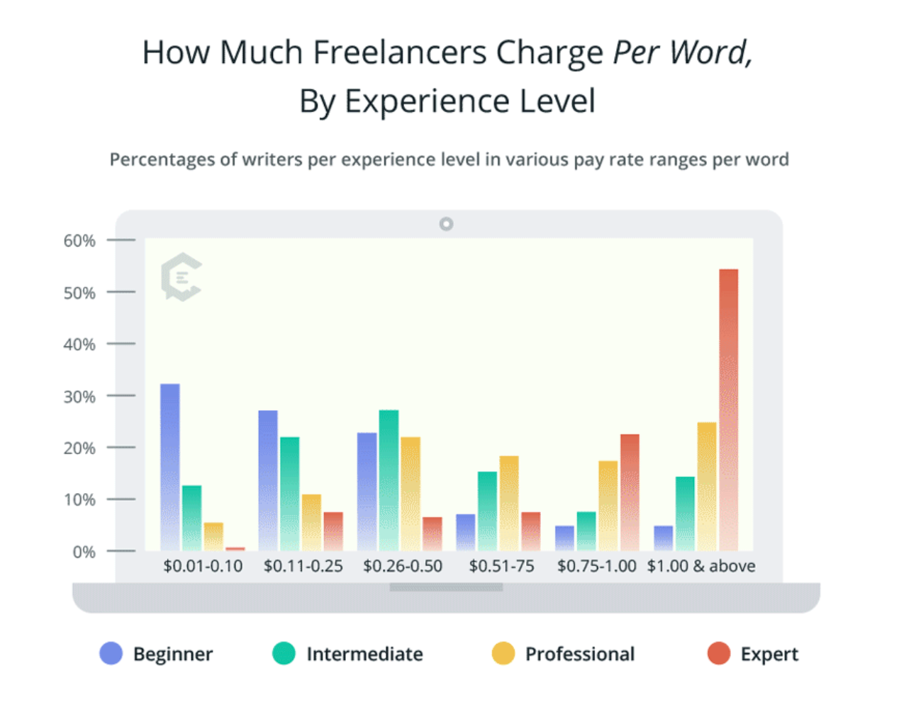 ClearVoice encuestó a escritores en 2018 y descubrió que a la mayoría de los escritores de nivel intermedio se les pagaba entre 11 y 50 centavos por palabra. En promedio, a los escritores expertos se les pagaba $1 por palabra o más.