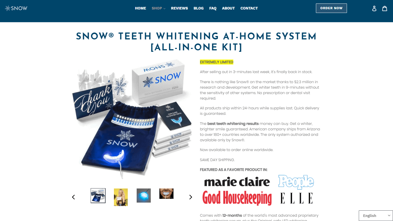 Snow (una empresa que vende productos para blanquear los dientes) muestra los logotipos de las revistas en las que se ha mencionado positivamente justo debajo de la descripción principal del producto.